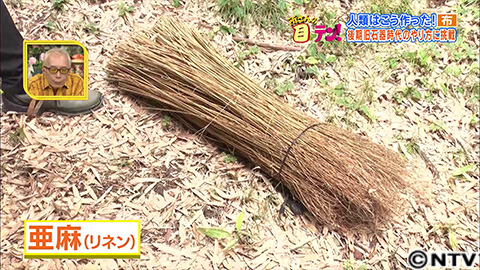 そこで、石器時代にかえって森の中で布を作ってみます。高須賀先生も初めての挑戦。ということで、東北大学の佐野勝宏教授に時代考証をお願いしました。 今回、北海道で亜麻栽培を行なっている亜麻公社さんにお願いして、乾燥した亜麻を分けてもらいました。