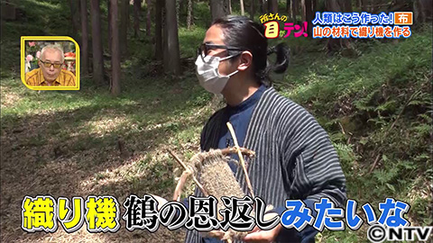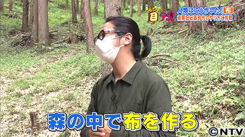 古の布を再現する為、石田さんがやってきたのは自然豊かな都内の森。合流したのは東京造形大学の高須賀先生です。高須賀先生は自然の素材から、機械を用いない原始的な方法で布を作り出し、服に仕立てる研究をしています。