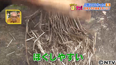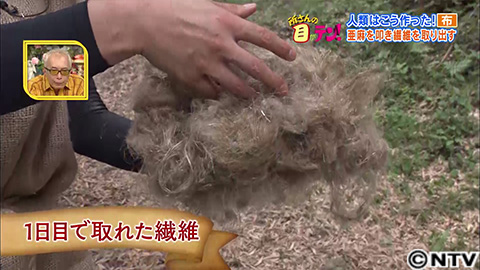 大量の繊維を取り出すべく必死に叩き続けること40分。とれたのはたった一握りの繊維でした。これでは、あまりにも効率が悪いように思えます。実は、石田さんが叩いていたのは、乾燥させただけの亜麻でした。