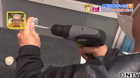 まずは、適当な大きさの柔らかい石を探し、硬い石でほじり続けると穴を空けることができます。その作業は何日もかかってしまうため、今回はドリルを使って時短します。