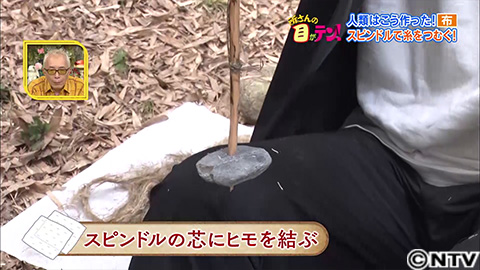 そして、まっすぐな枝をとがらせて、石の穴へと差し込むとスピンドルの完成です。スピンドルの芯にヒモを結びつけて、そのヒモに繊維の一端を絡ませてスピンドルを回すと、どんどん糸が紡がれていきます。そして、できあがった糸はスピンドルの芯に巻き付けていきます。こうすれば撚りが戻って糸が切れることもありません。