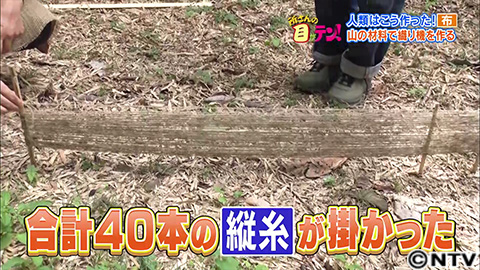 その竹を地面に打ち込みます。さらにもう1本の竹を1.5m離れた場所にも打ち込み、最終的には4本の竹を一直線に。この後、両端の竹に糸を往復させて、縦糸にします。糸を結びつけたら、その糸をそのまま20往復。合計で40本の縦糸がかかりました。