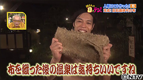 温泉で布作りの汗を流した石田さん。作った布で体に着いたしずくを拭ってみると、見事に水分を取り去ることができました!
