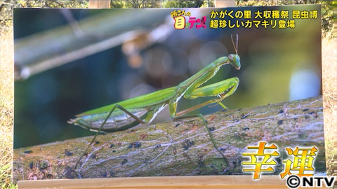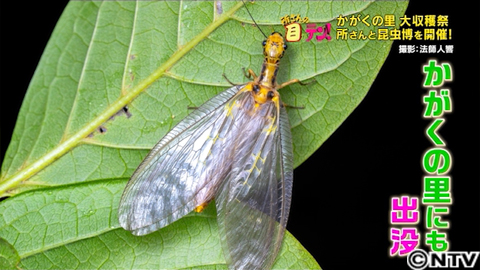 昆虫大博覧会!続いては畑の奥のエリアへ。ここにスゴイ昆虫がいたんです!それが、緑色のコカマキリ。多くのカマキリは、丈の高い草や低木の葉の上で暮らしているため、体はほとんどが緑色で、天敵やエサとなる虫から身を隠すことできます。一方、コカマキリは、枯葉の多い地表近くなどで生息しているため、周囲に溶け込む茶色の個体がほとんど。緑色は非常に珍しいんです。なぜ緑色の個体が出現するのかはまだ研究中で理由はわかりませんが、今回希少な緑色のコカマキリに出会えたのは斉藤先生も驚く幸運。