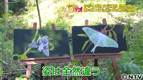 裏山では超貴重な発見が!展示されていたのは、オオミズアオ、ナマリキリガの写真。