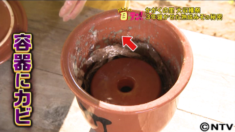 その前に、所さんがつまんだ味噌!実はこの味噌、3年半前に大豆から育て、それを発酵させて作ったものなのですが、今回の収穫祭の前にみてみると容器の中にカビが!