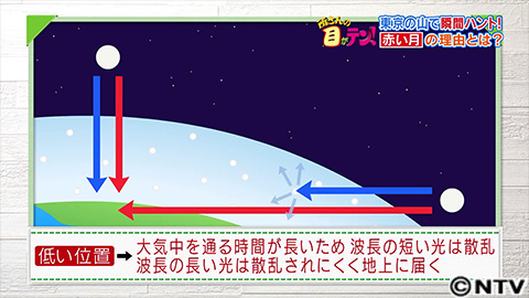 でも、なぜ月が赤いのでしょうか。よく見る月は白っぽく見えますが、これは波長の長さの違う様々な色の光が混じっているため。しかし、波長の短い光は、地球の大気を進む途中で、チリなどにぶつかり、散乱しやすい性質があります。月が高い位置にあるときは、大気を通る時間が短いため、波長の短い光も届きますが、低い位置にあるときは、大気を通る時間が長いため、青い光のように波長の短い光は散乱し、赤い光のように波長の長い光は散乱されにくく、私たちの目に届くのです。
