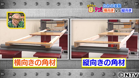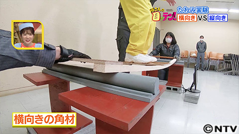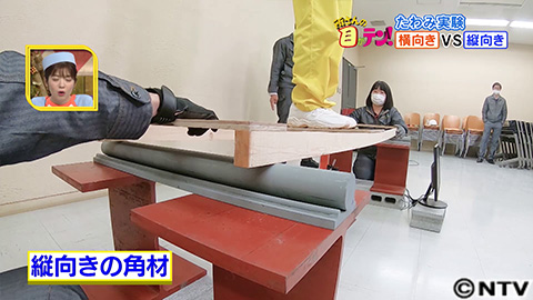 ここで実験。同じ25mm×50mmの横向きにした角材と縦向きにした角材を用意。下に計測器を設置し、阿部さんに乗ってもらいどれぐらい角材がたわむのか計ります。