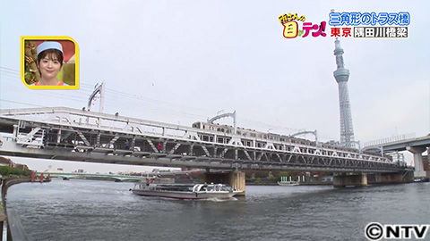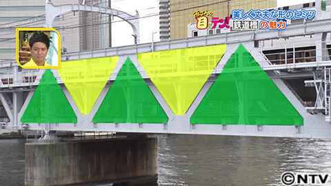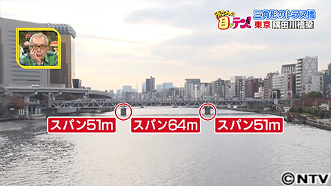 隅田川に架かる長さ166mの橋です。この橋は、鉄道橋に代表されるある特徴的なものが採用されています。それは、トラス橋という形式。トラス橋とは、三角形の性質をうまく利用した橋。