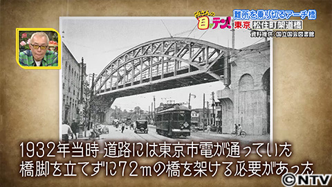 1932年当時、交差点は東京市電が通っており、橋脚を立てずに72mの橋を架けなくてはなりませんでした。当時のトラス橋のスパンの限界は60mと言われていました。そこで、曲げに強いアーチ型にすることでより長いスパンを確保することができたんです。