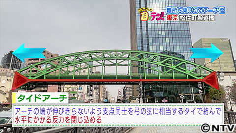 このアーチ橋はタイドアーチと呼ばれる形式。一番下の真っ直ぐの部材のことをタイ材と言います。なぜこのような部材が使われているのでしょうか?