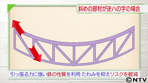 実はここにも鉄道橋ならではの工夫が!斜めの部材がハの字の場合、桁がたわんで変形したとき、斜めの部分が圧縮する力を受けます。すると、座屈と呼ばれる折れ曲がる現象がおきるリスクがあります。逆ハの字にした場合は、反対に斜めの部分が引っ張られる力を受けます。鉄は引っ張る力に強い性質を持つので、たわみを抑え、折れ曲がるリスクを軽減していたんです。