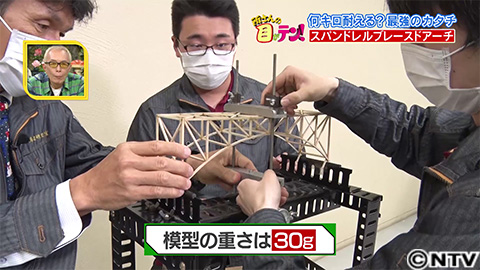 スパンドレルブレースドアーチはどれほど丈夫なのか?ここで実験です。アーチとトラスを組み合わせたスパンドレルブレースドアーチの模型を作り、そこに、重りをぶら下げ、何kgまで耐えられるかを計測。この橋自体の重さはなんと約30gです。