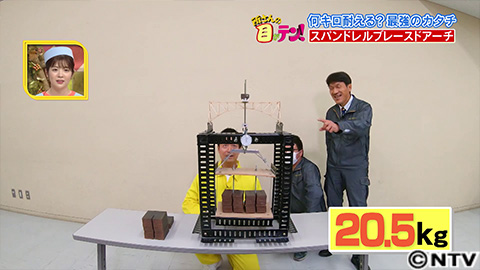 台の重さを含めた3.28kgからスタート。おもりは一つずつ載せていき、10kg、そしてなんと20kgも突破!結果は、驚異の29.2kg! アーチがない、一般的なトラス橋と比べると、最大荷重を自重で割ったスパンドレルブレースドアーチの自重倍数は964。およそ1000倍の重みに耐えるという結果になりました!