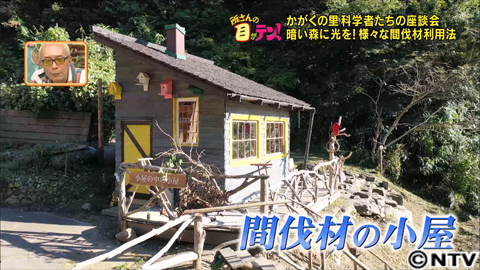 西野さんたち林業家の皆さんの指導と、阿部さんの頑張りで、たくさん出た間伐材は、木材利用の専門家、村田先生と共に、机にしたり、お皿にしたり、ギターを作ったり。さらに、間伐材を利用して小屋まで建てちゃいました!