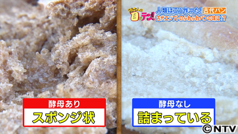 目がテン!が発明の原点に立ち返る、人類はこう作った!発見された中でもっとも古いフワフワのパンは古代エジプトで作られたものでした。そこで、石田さんと都丸さんが当時の方法でパン作りに挑戦。