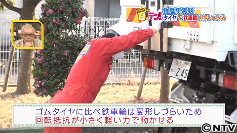 ここで実験。アスファルトの道路とレールの上、両方を走ることができる軌陸車を用意し、一般的な車と鉄道の車輪にどのような違いがあるのか見ていきます。総重量はおよそ7t。手で押す部分には体重計を設置し、途中どれだけのパワーがかかったのか目安を計ります。