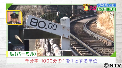 早速、登山鉄道を体験。箱根湯本駅から出発してすぐに長い坂を上っていきます。鉄道では規格外の急勾配で80‰(パーミル)。1000m水平に動くと80m登る勾配になります。鉄道などの勾配は、‰(パーミル)という単位で表します。‰(パーミル)とは千分率のこと。
