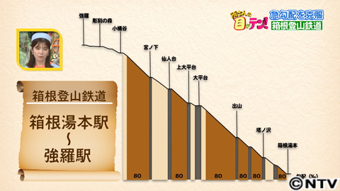 距離と勾配を表示した路線図を見ると、箱根登山鉄道では、ほとんどの区間で80‰(パーミル)の急勾配を上り続けていることがわかります。