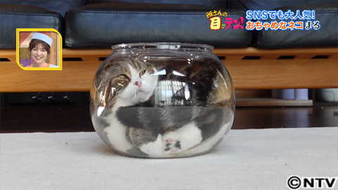 今やネコ界のレジェンド、SNSでも日本トップクラスの人気を誇る「まる」。まるの得意技が、狭いところを見つけると、とにかくダイブ!さらに、小さな金魚鉢に全身がぴったり入ってしまいます。