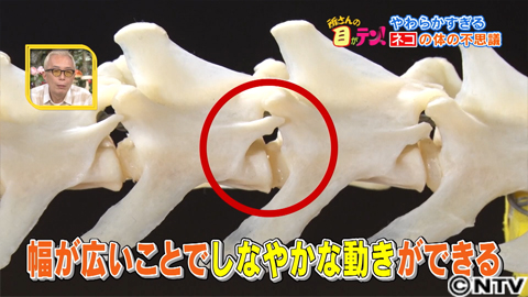 ネコの骨格標本を見ると、特徴的なのは、細かい骨が連なった弓のようにしなやかな背骨。実はネコ、背骨の骨と骨の間が広いので、大きく背中を反ることも、反対に頭とお腹がくっつくほどに折り曲げることもできるんです。