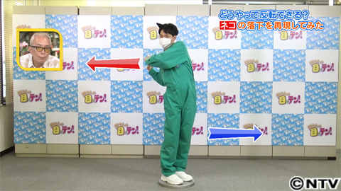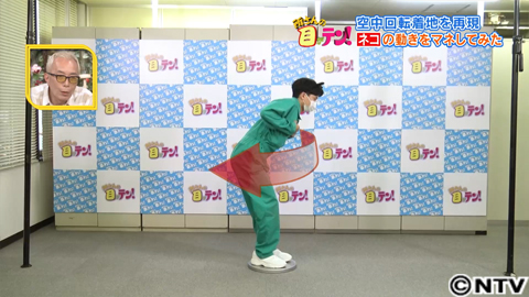 ではどうしたら回転することができるのでしょうか?ネコは、落下直後に体をネコ背に曲げた姿勢になっています。ところが落ち始めると体を横にひねり、その次にはお腹を伸ばして猫背ではなくなっています。この腰をぐるっと1周回すということを意識して動かすといいとのことですが…。言われた通り、猫背の姿勢から腰を大きく動かしてみると、見事、体全体を反転させることができました!
