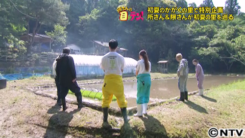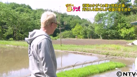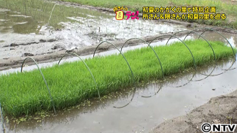 最初に見たのは、田んぼと畑。去年は、田んぼに苗代を作り、そこに育苗箱を置いて稲の苗を育てましたが、今年は、水田の一角で、昔ながらの苗づくりに挑戦しています。その方法は、苗代に苗専用の土を入れ、そこに芽出しが終わった種もみを直に蒔いて、さらに上から土を振りまきます。直射日光を避けるため苗代全体に布を乗せ、鳥に種籾をついばまれないようビニールを被せました。苗が乾燥しないように、水が通る道を作って作業は終了。