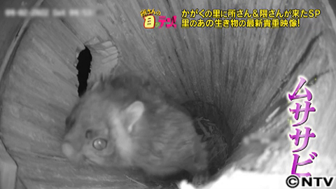 そして、もうひとつ見ていただきたいもの、それが動物観察カメラ。里の各所に付けられたカメラの映像が常に映され録画しているんです。去年10月に設置した西野さん手作りのムササビ用巣箱には、4月、ついにムササビがやってきました。