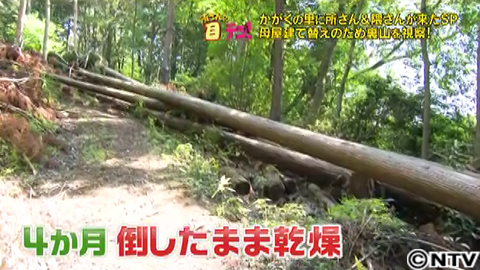 今年1月。母屋の建築に使う木材として西野さんと阿部さん、五島さんが裏山で杉の木の間伐をおこなってきました。およそ15本の杉の木を伐採し、それから4ヶ月、倒したまま乾燥させていたんです。