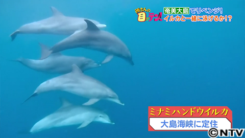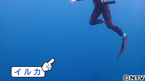 怖がっていないようなので、急いで海へ!しかし、見失ってしまいました。4年後しのリベンジも、ここまでか。すると、再びイルカが接近!そして決定的瞬間を、藤井先生がカメラで捉えていました。佐藤アナのすぐ下を、3頭のイルカが泳いでいきました!念願の、イルカと一緒に泳ぐ夢、達成しました〜!