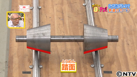 そこで、宮本教授が取り出したのは、円錐を切り取った形をした鉄道車輪のモデル。この車輪。よく見ると、車輪の踏面と呼ばれるレールと接する面が、斜めになっています。