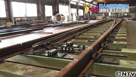 トングレールと隣り合うレールの断面を見ると、先端の隙間は規格で最大0.5ミリとなっており、工場では、さらに細かい精度で密着するよう作られています。そんな驚くべき精度のトングレールは、なんと職人さんの手作業で作られているんです!例え設計図通りに削り出したとしてもレールによって1本ずつ微妙な誤差が生まれるため、最終的には、手作業でレールの曲がり具合を測りながら職人が経験と勘を頼りに、コンマ5ミリ単位の驚きの精度で曲げ加工してトングレールがピッタリ合うように作られているんです。
