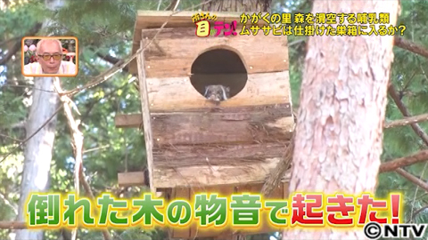 そんなある日、裏山で間伐を行っていた時のこと。阿部さんが驚きの光景を発見!そこにはフクロウの巣箱から顔を出すムササビが。これは、ムササビがいつも来ていた巣箱ではなく、里に近い巣箱。でもムササビは夜行性。なぜ昼間に顔を覗かせていたのでしょうか?