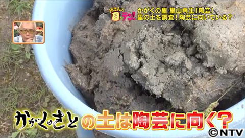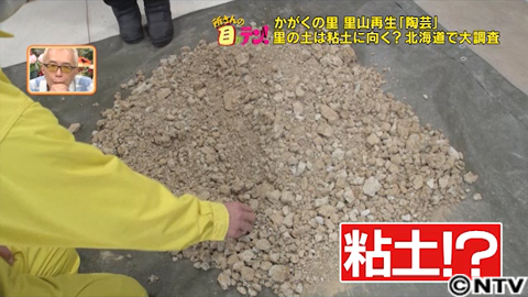 2人が狙ったのは、排水工事のため掘った穴。すると、自ら花瓶も焼いている里の達人、西野さんから土選びのポイントが!なんと、作物を育てている表面の土は陶芸に向かないそう。ということで、それぞれ「ここぞ」という場所の土を採取。