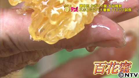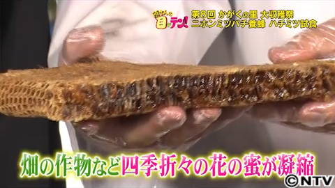 蜜を採る方法は、落下防止の棒で補強してある巣の上の部分を隈さんにワイヤで切ってもらい、ミツバチを刺激せず蜜をいただくというもの。隈さん、人生初の採蜜体験をし、里の恵みが凝縮したハチミツを試食しました。
