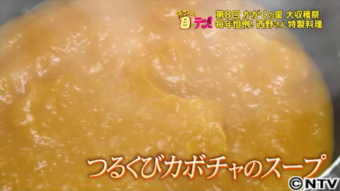 そして収穫祭のラストは、毎年恒例、西野さん特製の料理。今年は、里のイナゴの甘露煮と、つるくびカボチャの濃厚スープ。