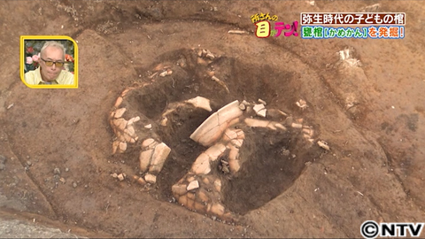 この甕棺は、ほぼ同じ大きさの2つの土器を合あわせるタイプ。出てきたのは分厚い土器の口の部分。掘り進めると、その厚さは5cmということがわかりました。割れてしまっていますが、甕棺の全体が見えてきました。