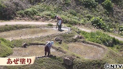 そして、2週間後、千枚田では田んぼに水を入れ、その水漏れを防ぐ「あぜ塗り」が行われています。