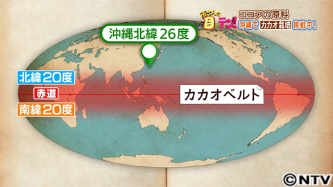 実は、カカオには非常に厳しい生育条件があり、真冬でも16度以下にならず年間の雨量が1500mm以上と高温多湿地帯であることが最低条件。その条件がそろうのが、カカオベルトと呼ばれる北緯20度~南緯20度の範囲。しかし、沖縄は北緯26度程度で、その生育地域には入っていないんです。