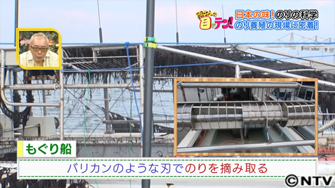 このもぐり船が網をどんどん引き揚げていき、船の上部のバリカンのような刃でのりを摘み取っていくんです。長さ18mののり網から採れる量は、なんと板のり200〜300枚分!のりの網を海に入れて、1か月くらい経つと一番のりを摘み始めることができます。