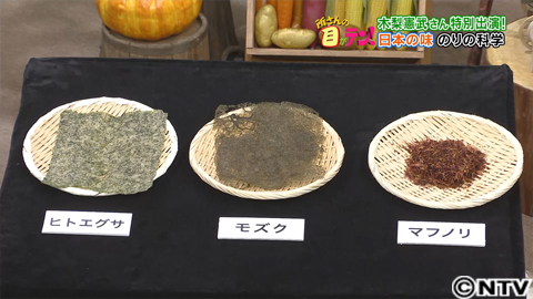 ヒトエグサとモズクは板状になりましたが、マフノリは、海藻の形状が板のりに向いておらず、乾くとバラバラになってしまいました。所さんとゲストの木梨さんがそれぞれ試食してみるも、どれもいまいちという感想でした。