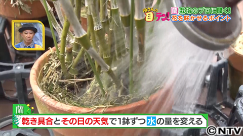 まずは蘭を育てるハウスにお邪魔しました。蘭の栽培を担当している村上さんに話を伺います。ハウスの中は常に15度以上、湿度80%に保っています。野生では、多くの種が木の幹に張り付いている蘭。雨が降っても、水が下に流れ落ちるような環境に適応し進化したため、それほど多くの水を必要としません。この絶妙な水量を再現し花を咲かせるため、一鉢ずつ根の湿り具合を確認し、またその日の天気などで根を腐らせないベストな水の量をあげるのです。
