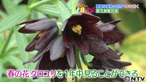 北海道で春にしか咲かない、クロユリ。咲くやこの花館では、1年中見ることができます。凍らせても、生命を維持できるクロユリ。球根が土の下に眠っています。次の部屋では、昼間は7度、夜は4度、と雪解け時期の気温で2週間ほど過ごします。さらに次の部屋では、昼は12度、夜は7度と温度をさらにあげて、15日間過ごします。徐々に温度を変えていくことで冷凍庫で眠っていたクロユリが蕾をつけ綺麗な花を咲かせるのです。このような開花調整技術によって、クロユリのような花も一年中見ることができるのです。