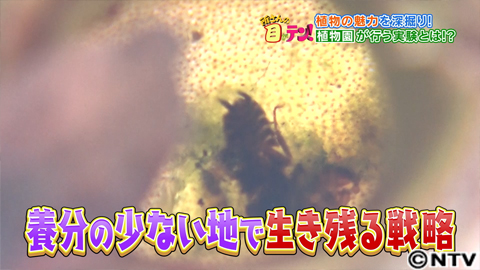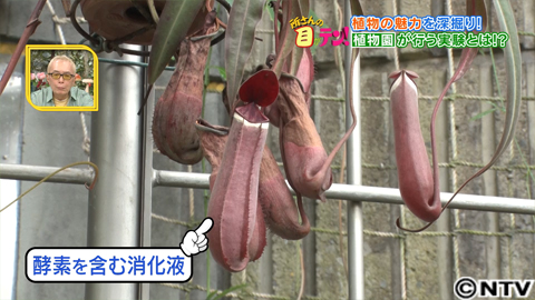 ここで、食虫植物の消化液をごちそうになります。蓋がしまっている間はクリーンなので飲むことができるんです。東南アジアでは、おねしょに効くと言われ飲まれているそう。虫を溶かす酸性の液体。そのお味は?…結構青臭い。