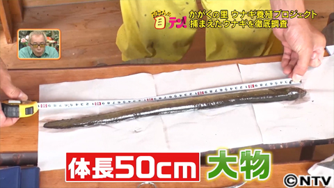 すると、今回捕獲したのは、3年前に池に放流したウナギだということが判明。天然のウナギは50cmになるのに4年はかかると言われているのですが、今回捕獲したウナギはそれよりも早い3年で50cmになっていることから、かがくの里のウナギは天然と同じかそれ以上のスピードで成長していることがわかりました。