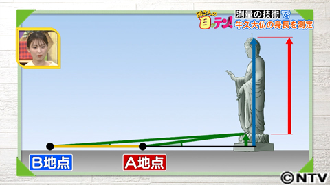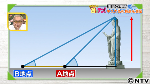 まずは、角度を測ります。今回は、台座を引いた、足もとから頭のてっぺんまでの長さ、身長を測ってみます。トータルステーションを置くのは、直線状に2か所A地点とB地点。A地点とB地点から測るのは共に、頭のてっぺんまでの角度。そこに、AB間の距離を測り計算すると、台座を含めた全体の高さがでてきます。