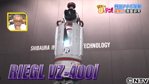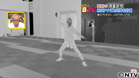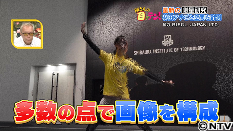 この機械は都市空間のデジタルコピーを取る研究に使います。デジタルコピーとは、目に見えるものに大量の点を打ち、立体的に計測すること。今回は、この部屋を立体的に計測。部屋の形や飾り、部屋のあらゆるものを点にします。林田アナにはポーズをとってもらい、部屋と一緒に、立体的に計測してもらいます。