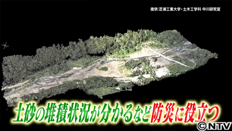 この技術で山などを計測すると、例えば土砂の堆積状況が、従来よりも、よく確認することができ、防災に役立てられ、一部実用化もされています。