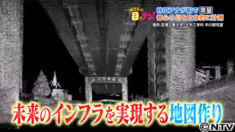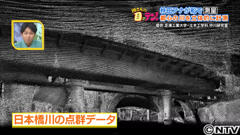しかし、船に取り付けられたレーザースキャナーが測ったデータを画像化すると、位置情報を持った点群で、橋の裏側や川岸の細かい形状まで立体で記録できていました。