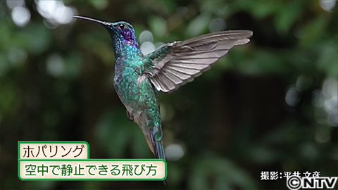 さらに、中南米に多く生息するハチドリ。体長10cm前後の小さな鳥です。特徴は、毎秒50回ほどの猛スピードの羽ばたき。そして、長いくちばしを使って蜜を吸う、その姿。よく見てみると、羽を単純に上下させているのではなく8の字を描くように動かしています。この飛び方は「ホバリング」と呼ばれ、空中に静止しながら飛ぶことができるのです。